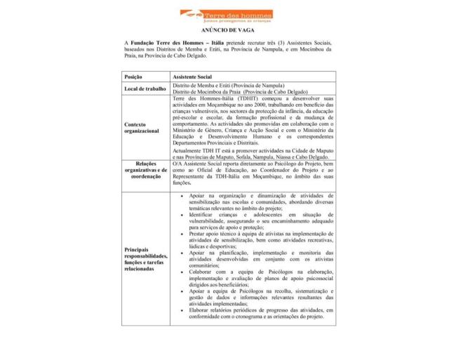 A Fundação Terre des Hommes – Itália pretende recrutar três (3) Assistentes Sociais, baseados nos Distritos de Memba e Eráti, na Província de Nampula, e em Mocímboa da Praia, na Província de Cabo Delgado.