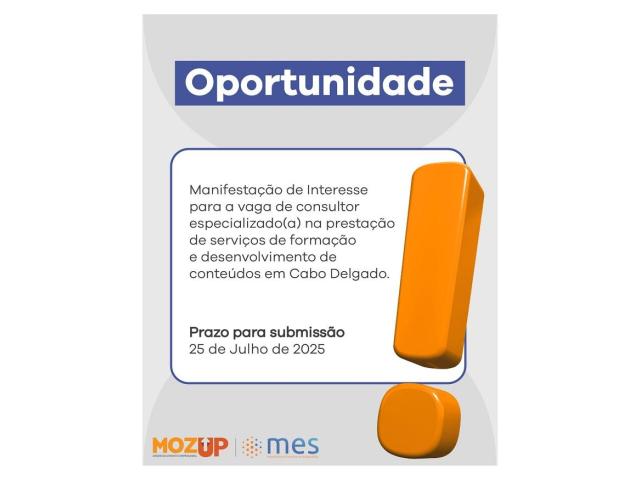 A Mozambique Enterprise for Sustainability (MES), convida profissionais interessados a responderem à Manifestação de Interesse para a vaga de consultor especializado(a) na prestação de serviços de formação e desenvolvimento de conteúdos em Cabo Delgado.