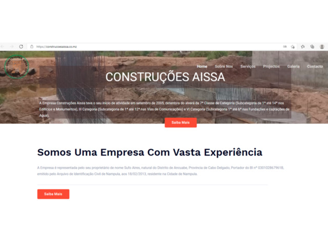 A Empresa Construções Aissa, portadora de Alvara da 7° Classe, vocacionada na Construção, Reabilitação, Manutenção de Obras de Edificios Públicos, Estradas e Pontes pretende recrutar (1) Motorista Profissional, (02) Encarregados de Obras de Estradas, (2) Serralheiros, (2) Carpinteiros, e (2) Ferreiros, (1) Operador de Retro-Esvadora, (1) Orador de Motoniveladora, (1) Operador de Escaveta Giratória, (02) Técnicos Medios de Construção Civil, e (06) Técnicos e Mestres de Construção de Ponte em Betão Armado para fazer parte da Empresa.