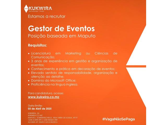 Estamos a recrutar Gestor de Eventos, para o nosso cliente, na província de Maputo.