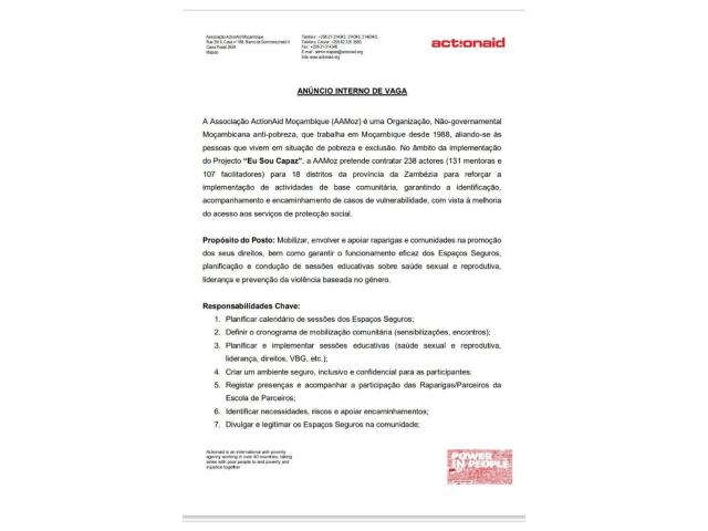 ZAMBÉZIA, Para Vários Distritos, a Associação ActionAid Moçambique (AAMoz). Está a recrutar 238 ACTORES ( nas quais 131 MENTORAS e 107 FACILITADORES). Abrangindo 18 Distritos da Província da ZAMBÉZIA.