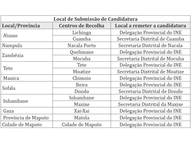 Os interessados devem submeter as suas candidaturas, no prazo de 30 dias, a contar da data da publicação do presente anúncio no Jornal Noticias, na Secretaria Geral do local para qual concorrem, conforme a tabela acima: