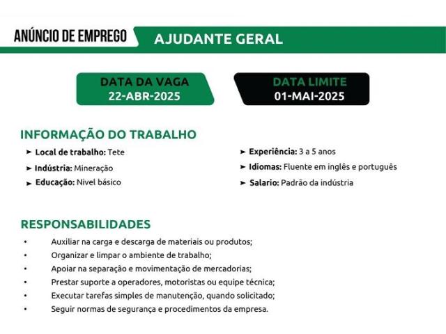 Nota: Por favor, escreva AJUDANTE GERAL na linha de assunto.