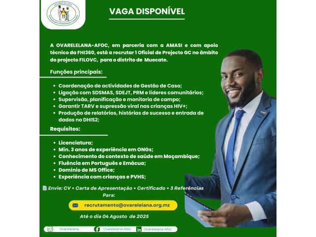A OVARELELANA-AFOC, em parceria com a AMASI e com apoio técnico da FHI360, está a recrutar 1 Oficial de Projecto GC no âmbito do projecto FILOVC.
