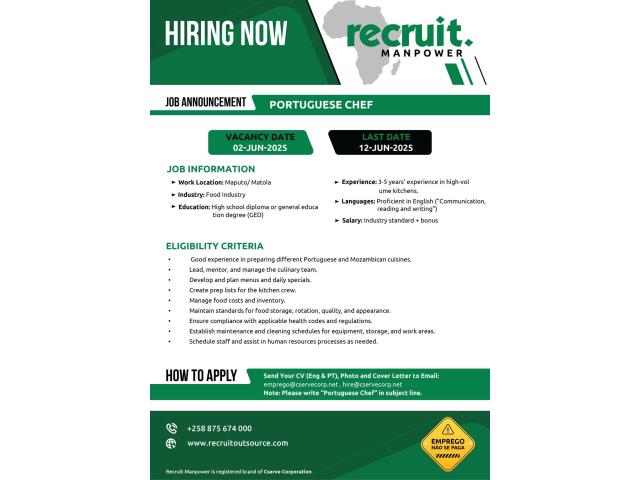 VAGAS URGENTES EM MAPUTO & MATOLA: Cozinheiros, Empregados de Mesa e Mais – Candidate-se Já!