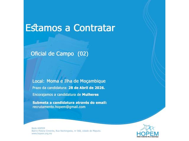 No âmbito do projecto Alcançar, cujas intervenções visam salvar vidas, através da melhoria da provisão de serviços de saúde materna, neonatal e infantil (SMNI) baseados em evidências através da entrega de um pacote de suporte técnico que incremente a capacidade do sistema de gestão de saúde. É implementado na provincial de Nampula, num consórcio liderado pela FHI360, com os fundos da USAID, onde a HOPEM conta com Oficiais de Campo, em diferentes distritos de Nampula. Para o efeito, pretende contrar dois oficiais de campo nível dos distritos de Moma e Ilha de Moçambique.