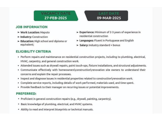 Assistente de Manutenção Estamos à procura de um Assistente de Manutenção, baseado em Nampula para apoiar na instalação e prestação de assistência técnica em equipamentos elétricos e eletrónicos. O profissional irá colab...