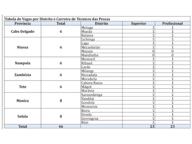 O presente anúncio de vaga tem por objectivo a comunicação da abertura de concurso público para a contratação de Técnicos Médio Profissionais, sendo que constituem atribuições específicas para o posto o conhecimento de pesca e aquacultura, na vertente de promoção e desenvolvimento comunitário.