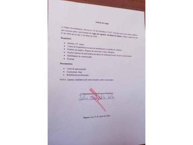 A Nduku Investimentos, sita na Av. 25 de Setembro nº1147, Vem por este meio tornar público um concurso para o provimento de vagas de Agentes da Linha de Cliente, válido a partir do dia 27 de Abril até ao dia 11 de Maio de 2026