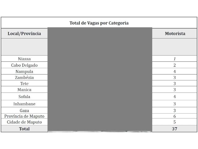 Assim, por Despacho de 27 de Maio de 2025, do Substituto de Sua Excia a Presidente do INE, foi autorizada a abertura de concurso para a contratacao de 37 Motoristas, para todas as Delegações Provinciais do INE, por um período de 4 meses, para o Censo de Empresas “CEMPRE 2025” a decorrer a nível Nacional, nos termos do disposto o nº 1 do artigo 34 do Estatuto Geral dos Funcionários e Agentes do Estado (EGFAE), aprovado pela Lei nº 4/2022 de 11 de Fevereiro, conforme a tabela abaixo: